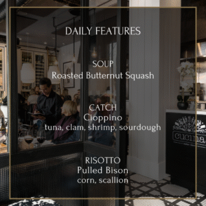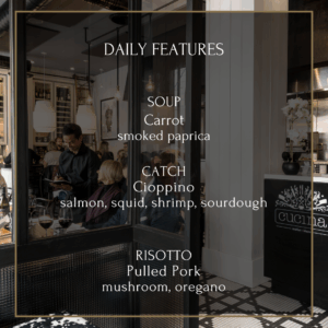 It is our pleasure to welcome you to Cucina, our kitchen & our cuisine. Our food is based on the philosophy of “less is more”, Allowing amazing ingredients to shine through preparations rooted in elegance & simplicity. Our dishes are designed to be shared and enjoyed in the same way we would on a Sunday at home.