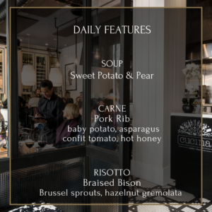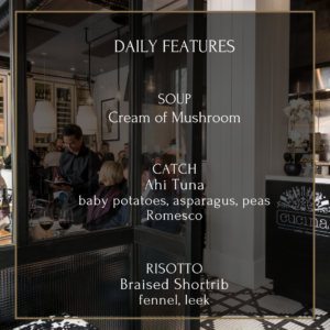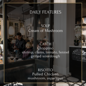 It is our pleasure to welcome you to Cucina, our kitchen & our cuisine. Our food is based on the philosophy of “less is more”, allowing amazing ingredients to shine through preparations rooted in elegance and simplicity. Our dishes are designed to be shared and enjoyed in the same way we would at home with friends and family.